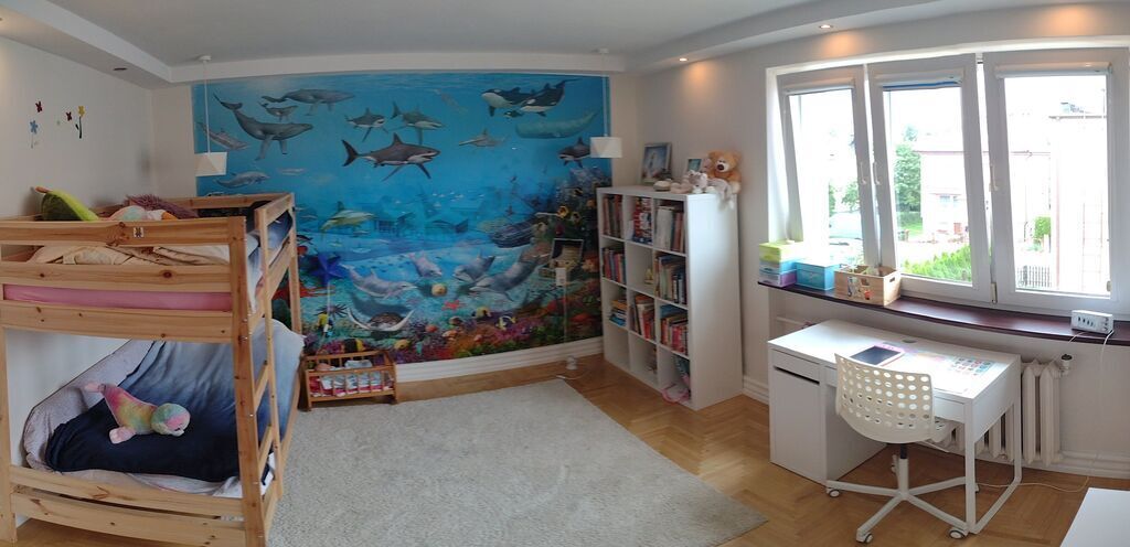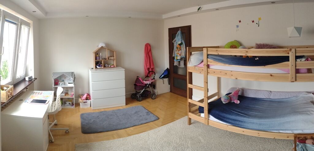 We have comfortable 160 m2 house. In ground floor there is a basement and garage. There you will find also a laundry room. In first floor we there are: a living room, dining room, kitchen, bathroom, a terrace and bathroom with a shower. In the second floor there are a big (30m2) bedroom with king size bed, a big bathroom, and three bedrooms which are our kids rooms.