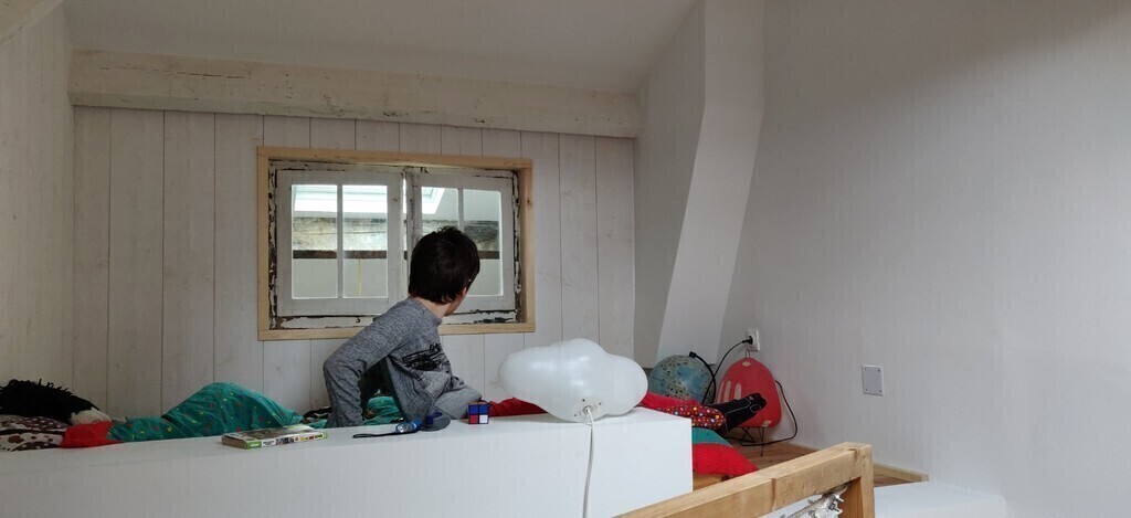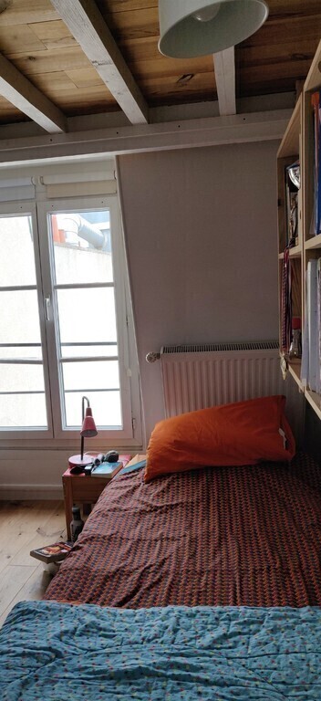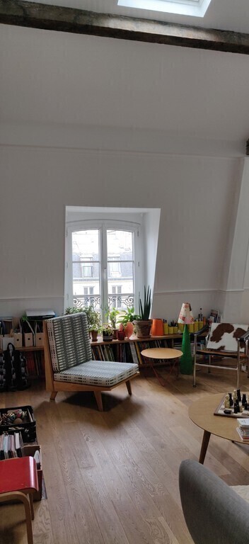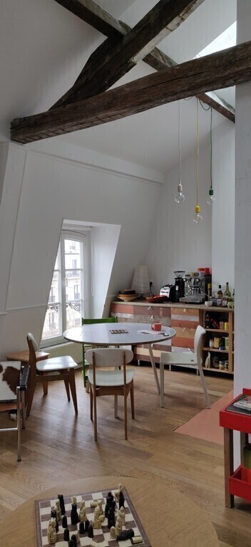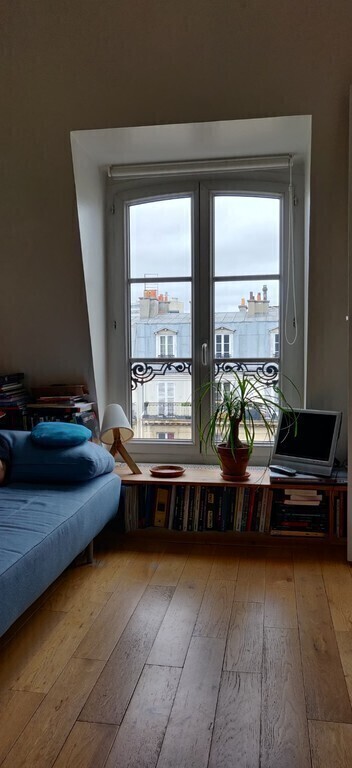 The flat is in the sixth floor of a tipical haussmanian building (end of XIXe century, but without lift) ; there are 2 bedrooms : one bedroom with a double bed in mezzanine, a small living room and a desk, the second bedroom with two single beds in two mezzanine and a games area with a small sofa. This small sofa can be used as a bed for a young child. In the flat, there are also a living room room with the kitchen, one bathroom and wc.