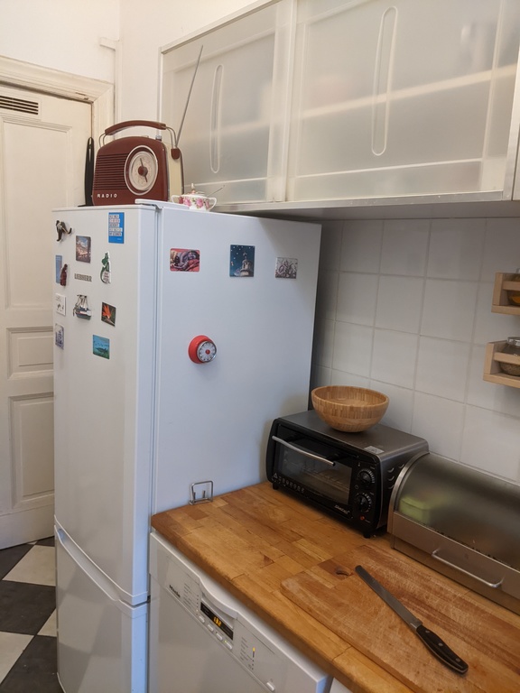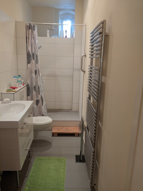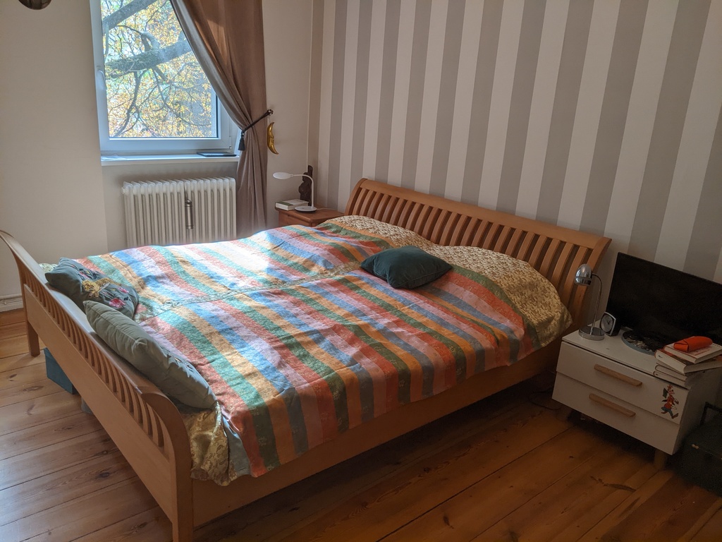 Our flat in the 2. floor is spacious (83 m²) with big sleeping room and kingsize bed, living room with big sofa (also usual as a single bed), television. There is also my studio, bathroom with spacious shower, and the well equipped kitchen, W-lan of course and different computers.
