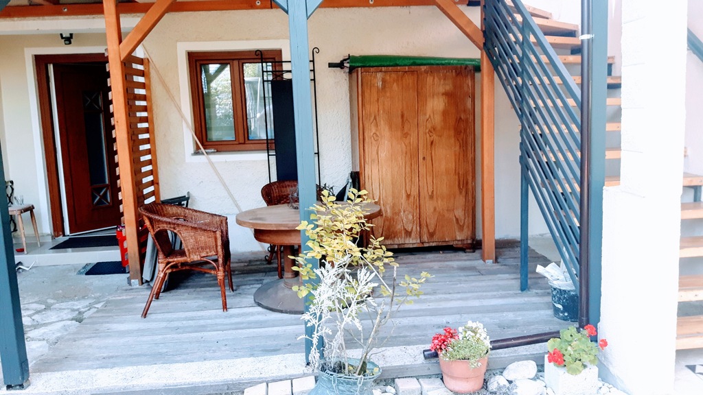 The apartment is about 80 m² and located on the second floor of a family house that has been divided into separate living units. It includes two bedrooms, a living room, a bathroom with toilet, a fully equipped kitchen, a terrace, a balcony, and access to the shared garden.