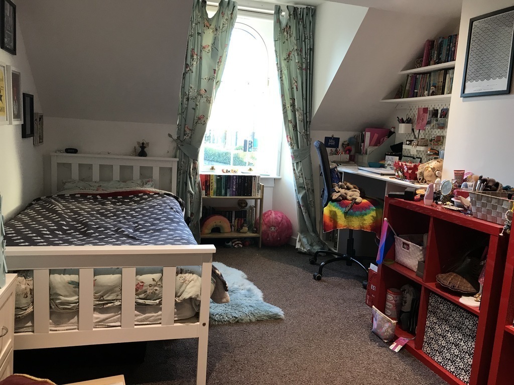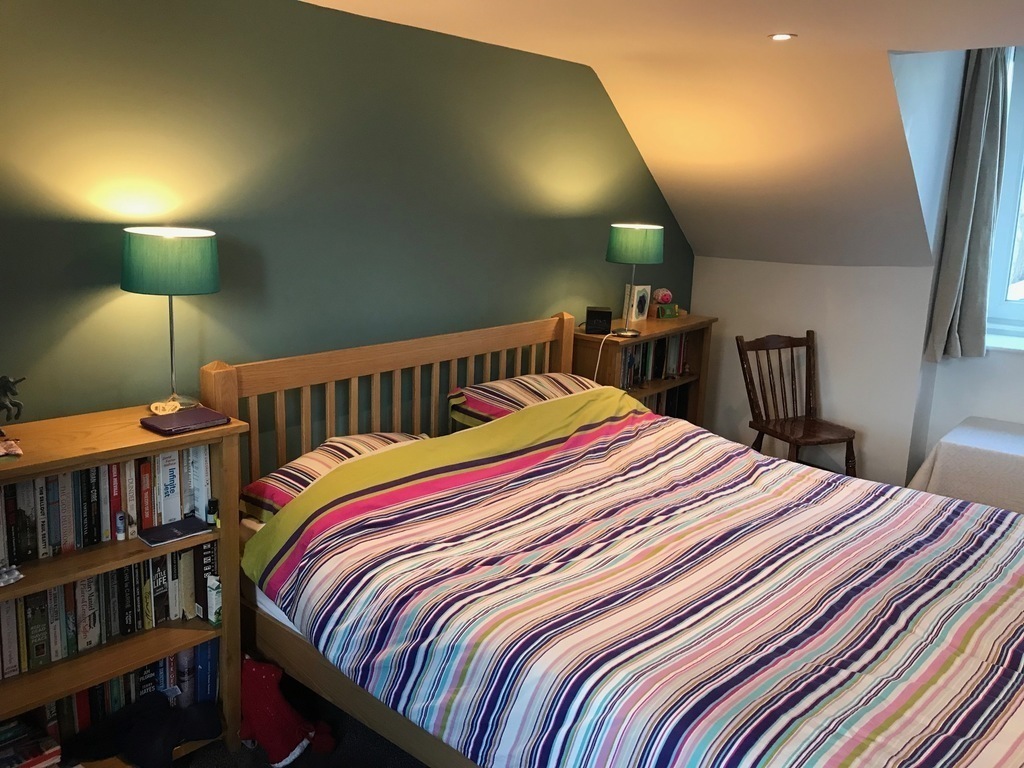 Upstairs there is one double bedroom (with view over trees and houses to the distant sea), two single bedrooms, a toilet, and small, children's reading area.