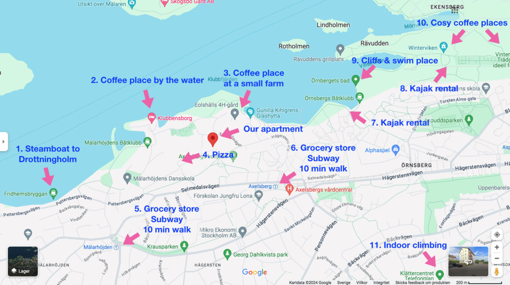 Along the lake Mälaren where we live you find coffe places and places to swim, see the links below.