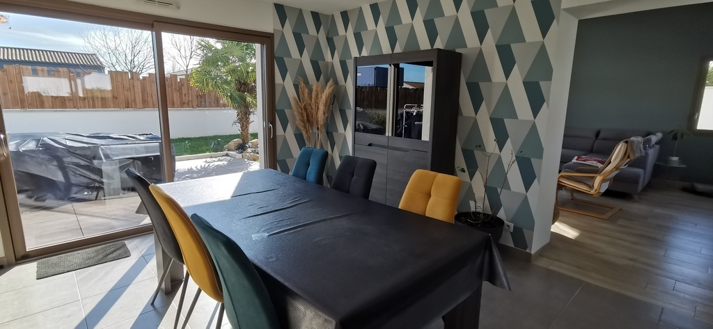 Terrain de 716 m2 avec un potager et une balançoire. Maison de décembre 2013 très lumineuse avec 135m2 habitable. Nous avons 3 chambres d'environ 10m2 avec placard (possibilité d'ajouter matelas supplémentaire ou lit parapluie) une salle de bain avec douche à l'italienne, baignoire et vasque. Une lingerie avec tout le nécessaire. Une cuisine ouverte sur le séjour d'environ 55 m2 et un coin salon de 25m2. Un garage de 30 m2 est aussi à disposition (possibilité de rentrer une voiture).