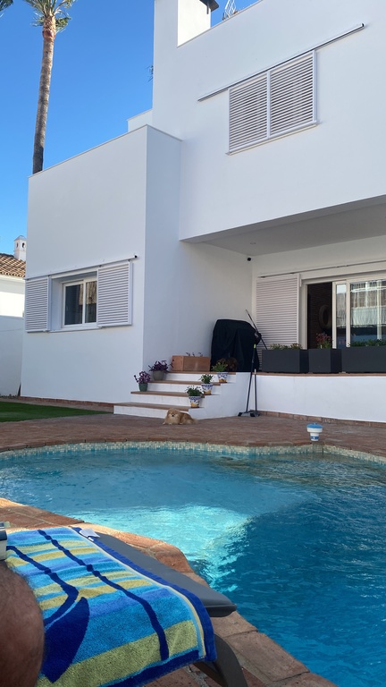 Tenemos una bonita casa moderna, dividida en tres plantas, con jardín y piscina privada que podrán disfrutar en familia. La planta baja es el garaje donde podrán guardar su vehículo, en la planta principal tenemos la cocina, el salón y un baño con ducha, así como un bonito porche con vistas al jardín y piscina. En la planta superior hay un estudio abierto, 3 dormitorios (dos dormitorios de matrimonio y uno infantil) y dos baños, uno de ellos dentro del dormitorio principal. Tenemos todo tipo de artículos para bebés y también para disfrutar de la playa o la piscina.